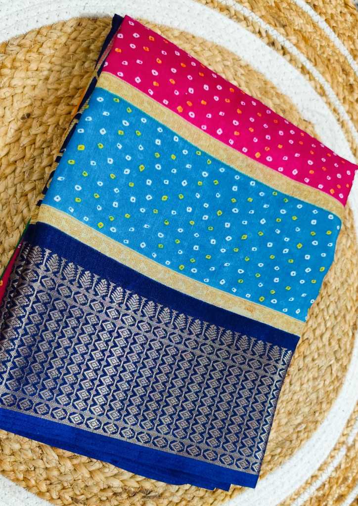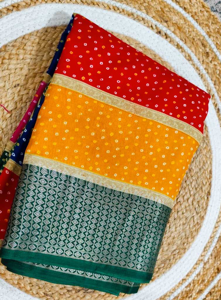 In a rainbow-colored version, the saree features a seamless blend of bright, eye-catching hues like red, orange, yellow, green, blue, indigo, and violet, often flowing in graceful patterns or gradients.