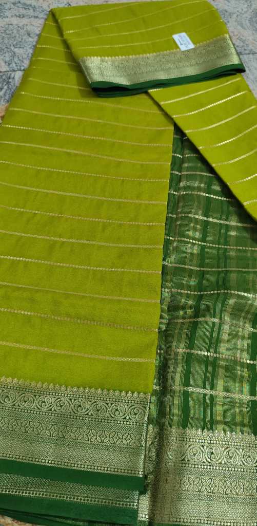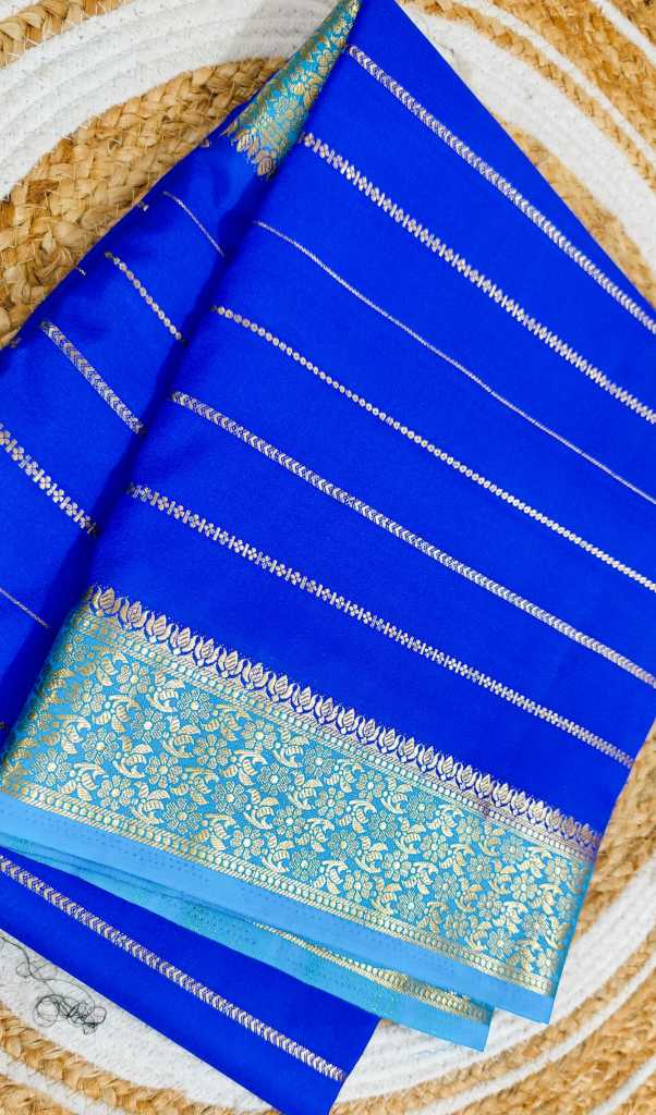 Semi Mysore crepe sarees typically feature beautiful designs like zari borders, delicate embroidery, or printed patterns inspired by traditional Indian motifs. They come in a variety of vibrant and rich colors, making them suitable for festive events, weddings, or everyday wear. Because they are lightweight and easy to drape, they’re a popular choice for those who love the classic Mysore style but prefer something more budget-friendly and manageable.
